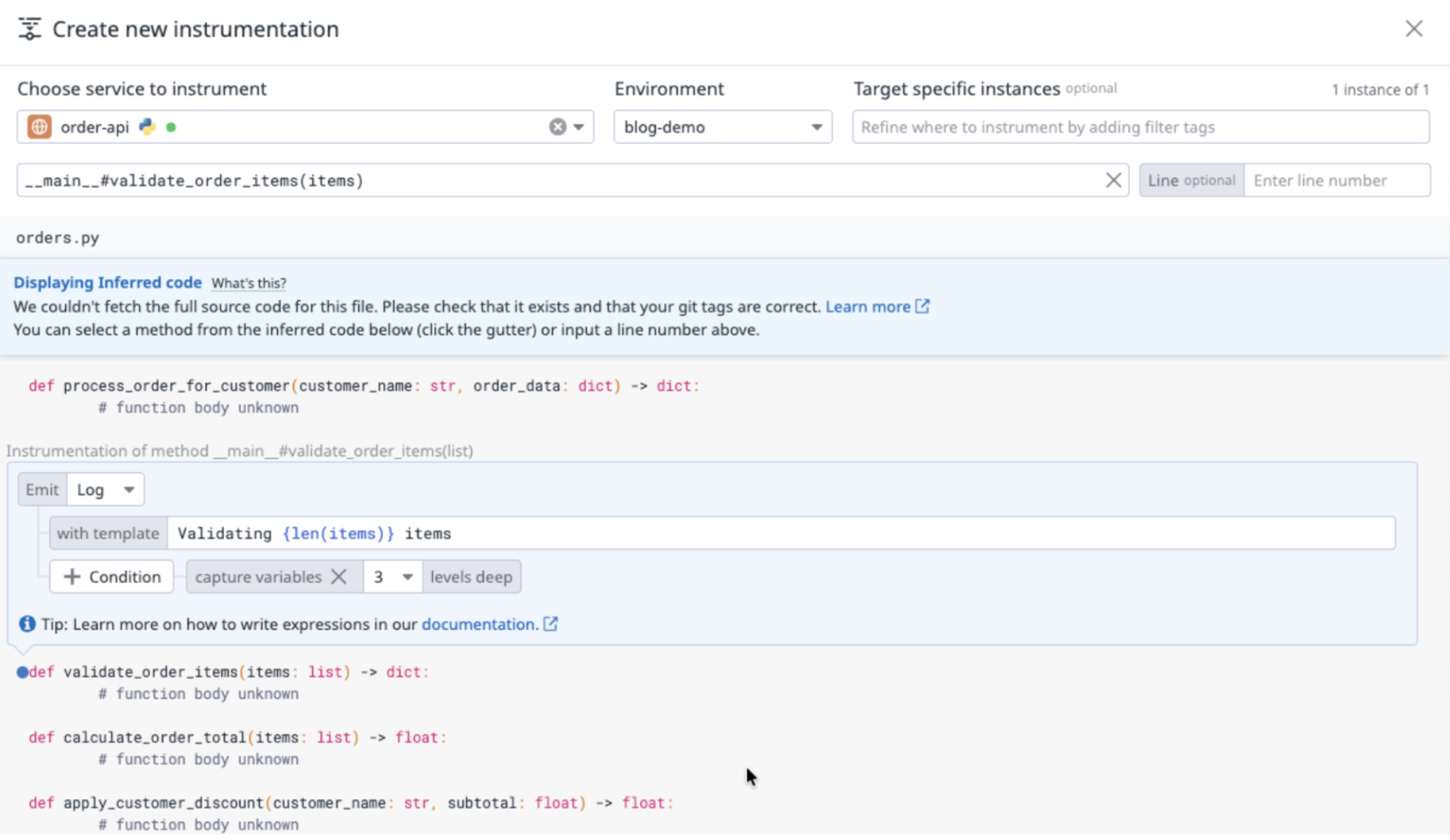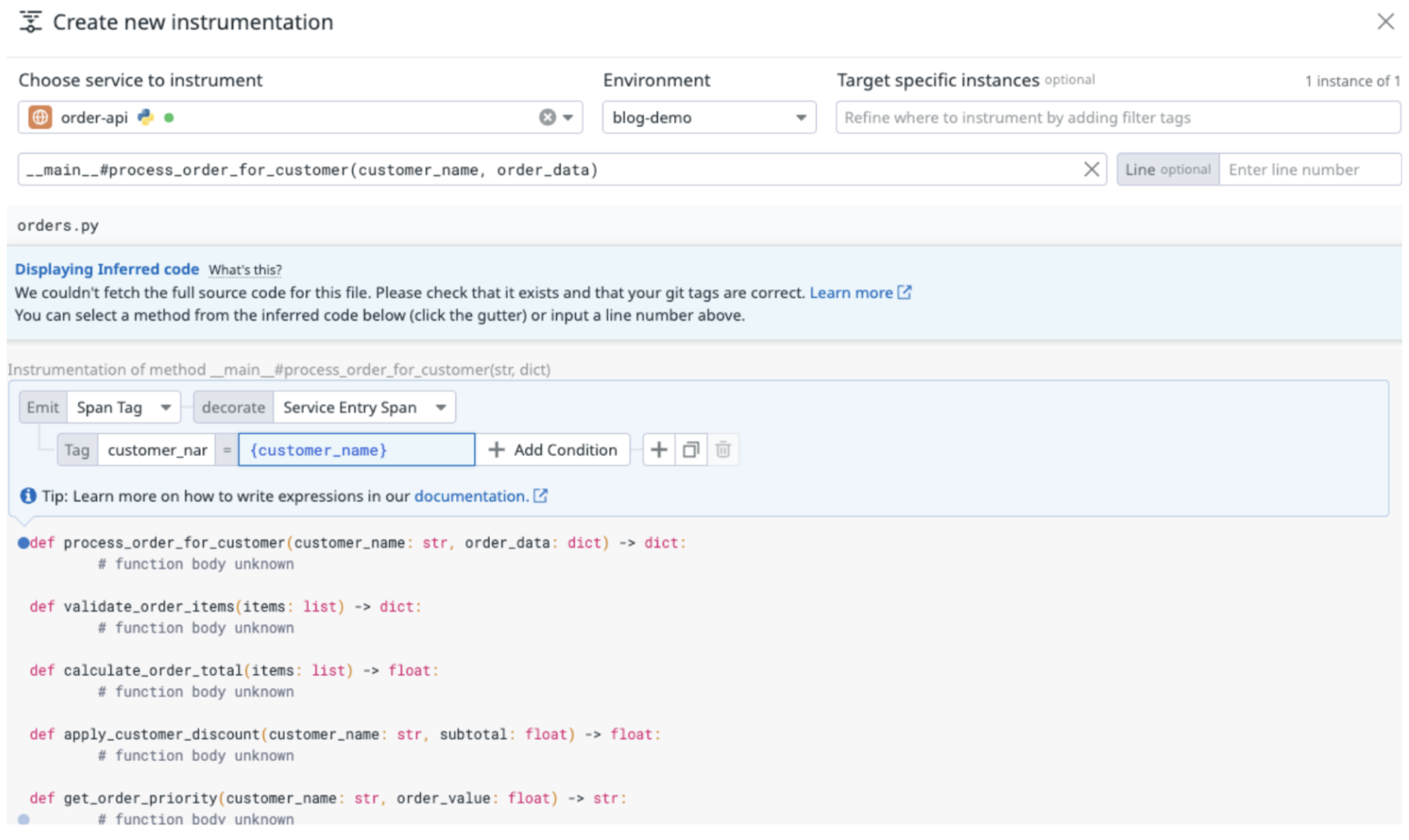 OR…we could have this data in moments. If we use Datadog Dynamic Instrumentation, we can add spans, span tags, and logs directly within the UI. Here is creating a span tag to represent the customer: