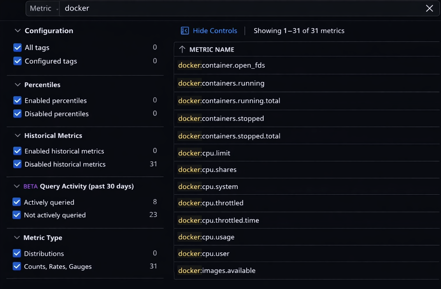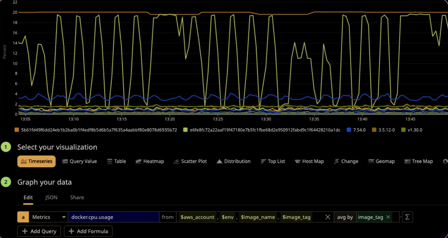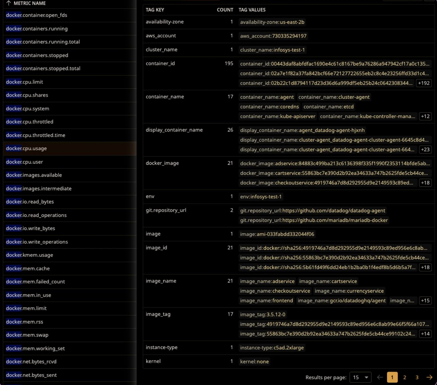 We’re starting to see some things that have a number of values that could be really important to us! There are some very high level tags like aws_account and availability-zone, middle level tags like image_name, and specific level tags like container_id. Let’s put a few of these to use.