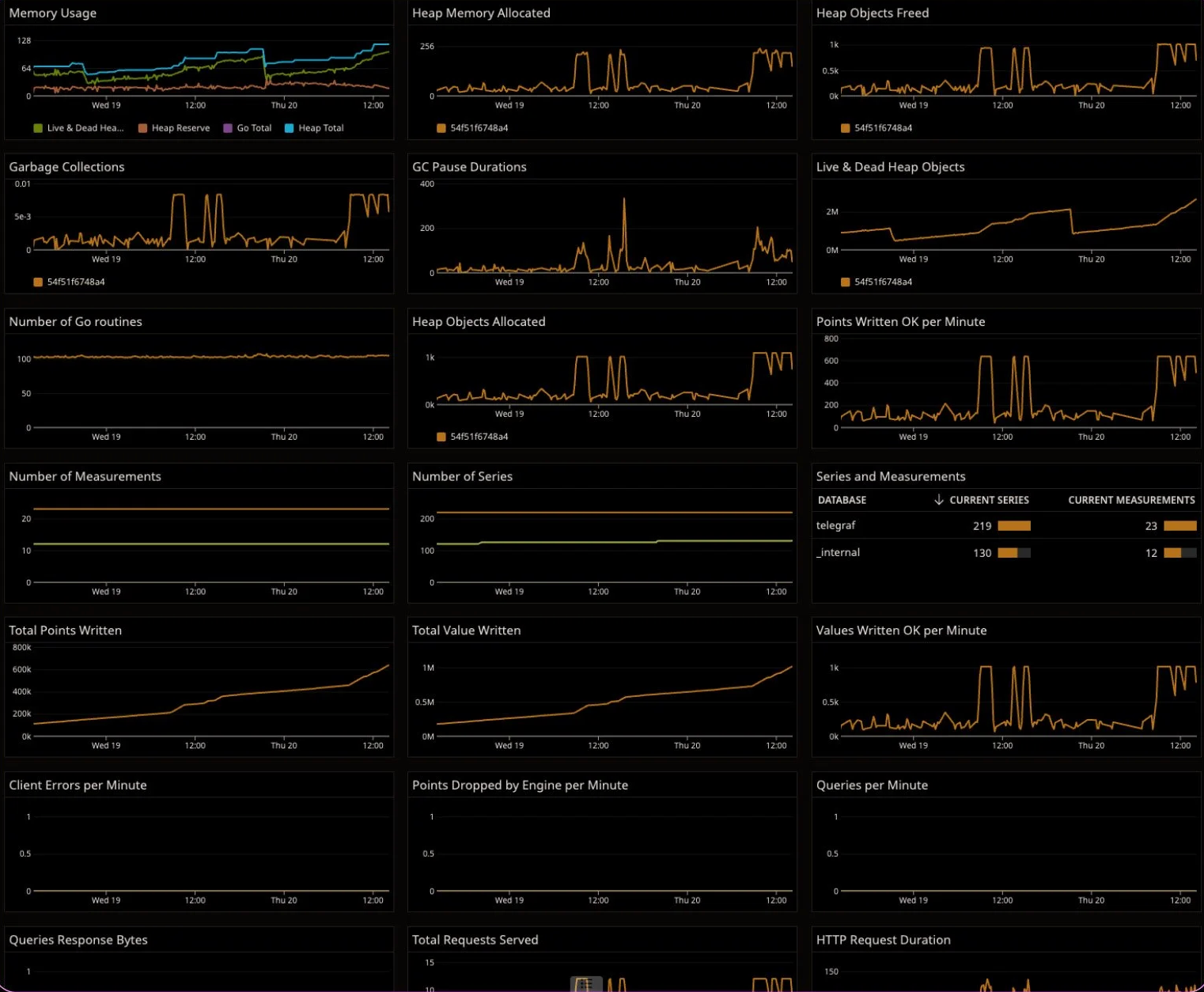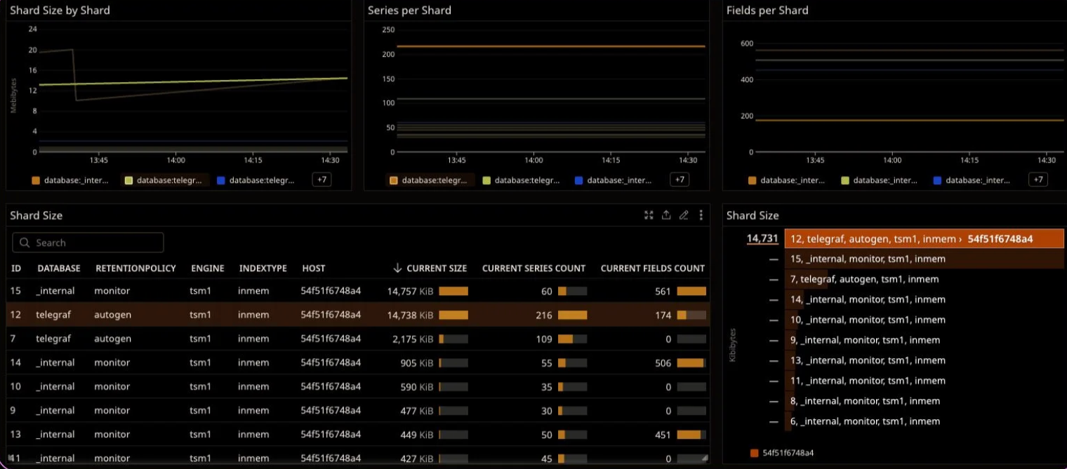 If you add a table and a top list, you can now mouse over a table row, and it will highlight the corresponding time series and toplist entries. In comparison, look at the legends of the time series charts. This example table clearly shows us the database, shard id, and some other info, whereas the time series chart shows us cutoff values. Figuring out what chart type works best can be pretty simple. What I like to do is create my initial time series widget, and then clone it (just so I can freely mess with it without ruining my other widget!) and start to change the visualization type right in the panel.